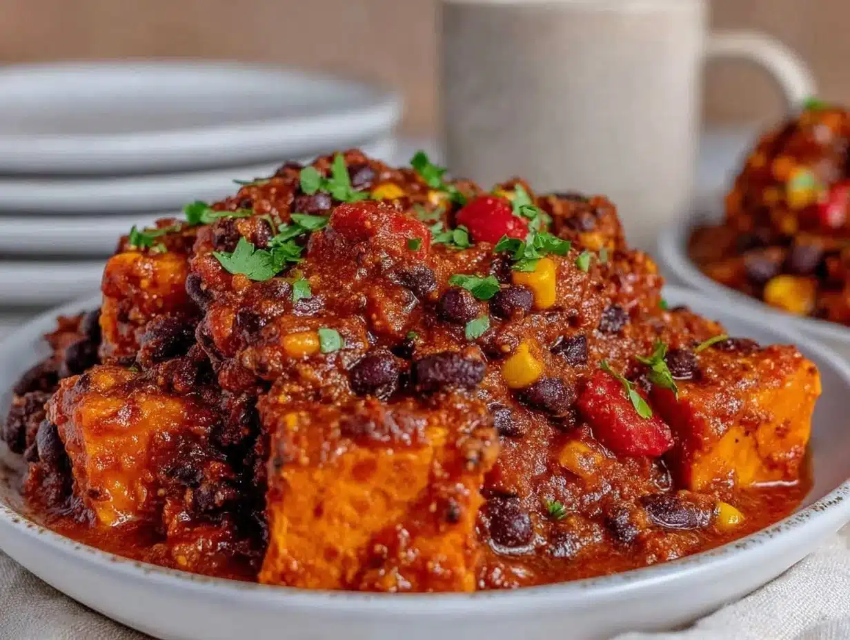 Here’s what makes my version different: I roast the sweet potatoes just enough to bring out their natural sweetness, then let them simmer in the chili so they soak up all that tomato-y, smoky flavor. I use fire-roasted tomatoes for a subtle depth (seriously, try it!), and a dash of smoked paprika for that “cooked all day” vibe—no meat required. You won’t find any bland, watery chili here. Every spoonful is thick, spoon-coating, and layered with flavor.