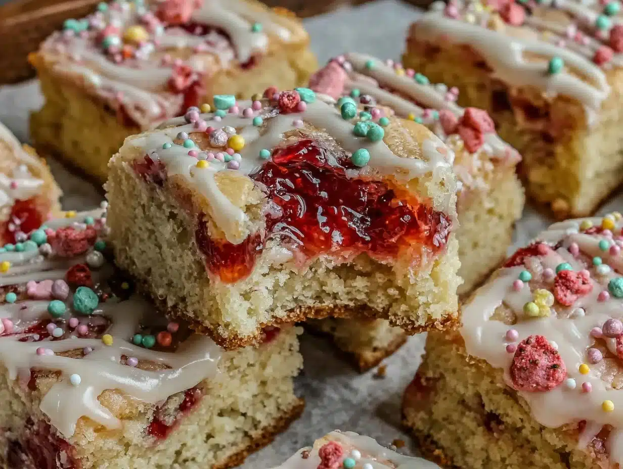 Soft, chewy cookie bars with a buttery base, sweet strawberry filling, and a drizzle of icing—perfect for nostalgic indulgence.